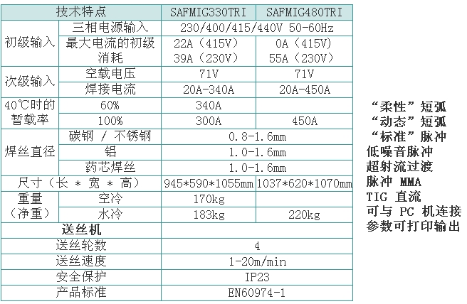 數(shù)字化雙脈沖鋁焊接設(shè)備,在汽車、造船、高速列車、航天航空及壓力容器等制造領(lǐng)域得到廣泛應(yīng)用。 SAFMIG330TRI/480TRI 脈沖熔化極氣保護(hù)焊機(jī)為 16 位微處理器閉環(huán)數(shù)字控制晶體管暫斬波電源、焊機(jī)內(nèi)焊接專家系統(tǒng),各種母材,焊絲,氣體組合焊接程序達(dá) 100 多組,協(xié)合式單旋鈕調(diào)節(jié),具有熱起弧功能,此外還設(shè)置了“雙脈沖”功能,適用于鋁及鋁合金,不銹鋼,碳鋼及低合金鋼的焊接。