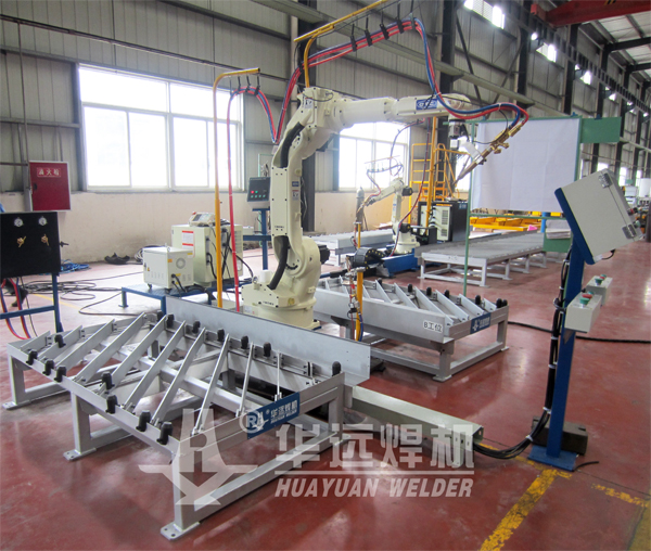 雙工位切割機(jī)器人工作站主要用于電力機(jī)車和煤機(jī)產(chǎn)品碳素鋼、低合金高強(qiáng)度鋼板材坡口的切割加工。為有效提高生產(chǎn)效率,減小工人勞動強(qiáng)度,工作站采用H型雙工位布局,兩個工位平行分布于機(jī)器人前后兩側(cè)。采用預(yù)約工作方式,一個工位切割的同時,另一工位進(jìn)行工件的裝卸。